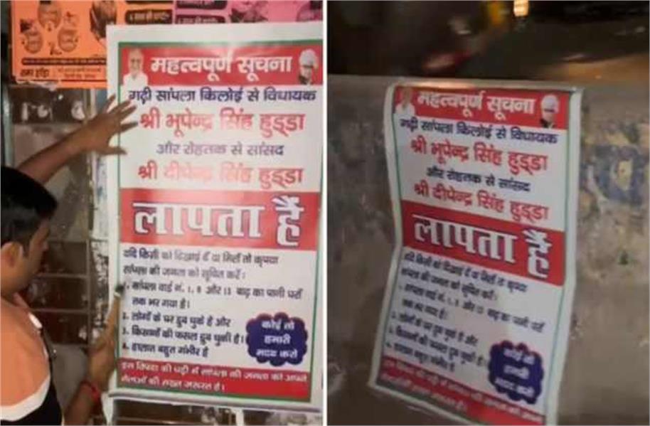 मंगलवार रात को पूर्व मुख्यमंत्री भूपेंद्र सिंह हुड्डा लापता व सांसद दीपेंद्र हुड्डा लापता होने के पोस्टर लगे हुए हैं। इन पोस्टर को सांपला नगर पालिका के पूर्व पार्षद शिव कुमार रंगीला हैं, जो 2 बार विधानसभा चुनाव भी लड़ चुके हैं। पोस्टर में लिखा था कि सांपला में बारिश की वजह से लोगों के घरों में पानी भर गया है। अगर दोनों कहीं दिखाई दें तो सांपला की जनता को सूचित करें। आखिर में लिखा- “कोई तो हमारी मदद करो।”