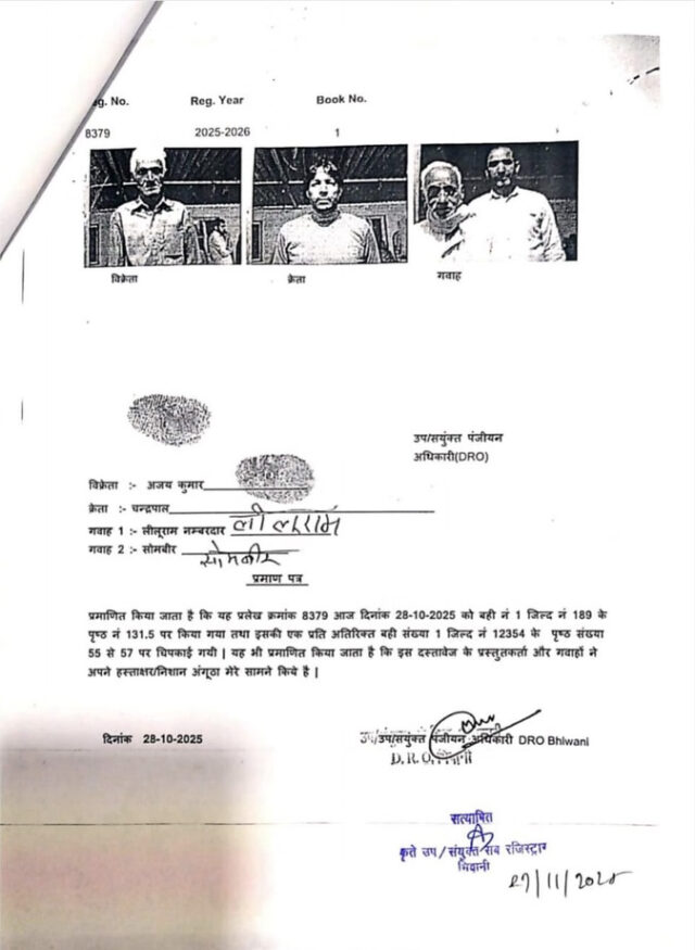 डीआरओ कार्यालय में तहकीकात कराने पर सामने आया कि उनकी भूमि को हांसी के गांव ढाणा निवासी एक व्यक्ति को 8 लाख 50 हजार रुपये में बेचा गया है और इसकी वसीका 28 अक्तूबर को जारी कर दी गई। अजय सर्राफ भिवानी न्यायालय में अधिवक्ता के रूप में प्रैक्टिस करते हैं। उन्होंने बताया कि रजिस्ट्री के दौरान खिंचे फोटो में फर्जी मालिक उनकी जगह खड़ा होकर उनकी भूमि बेच रहा है और हस्ताक्षर की जगह अनपढ़ व्यक्ति ने अंगूठा लगा रखा है।