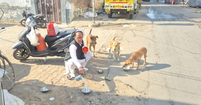 सेवा नगर निवासी सुरेंद्र सोनी ने बताया कि उनकी बेड बनाने की फैक्टरी है। पहले वे खुद काम संभालते थे अब उनके बच्चे काम संभाल रहे हैं। सभी बच्चे शादीशुदा हैं। जीवन की जिम्मेदारियां निभाने के बाद उन्होंने खुद को आध्यात्म और जीव सेवा के लिए समर्पित कर दिया। उन्होंने बताया कि उनके पास एक चार्जेबल माइक है जिससे वे रोज घर से निकलते समय ‘तो-तो’ की आवाज लगाकर लावारिस कुत्तों को बुलाते हैं। उनके पास दूध और रोटी देने के लिए छोटी कटोरियां हैं। भोजन डालते ही कुत्ते उसे बड़े चाव से खाते हैं। सुरेंद्र सोनी ने कहा कि सर्दी, गर्मी, बारिश या किसी भी विपरीत परिस्थिति में वे अपनी सेवा का नियम नहीं तोड़ते।