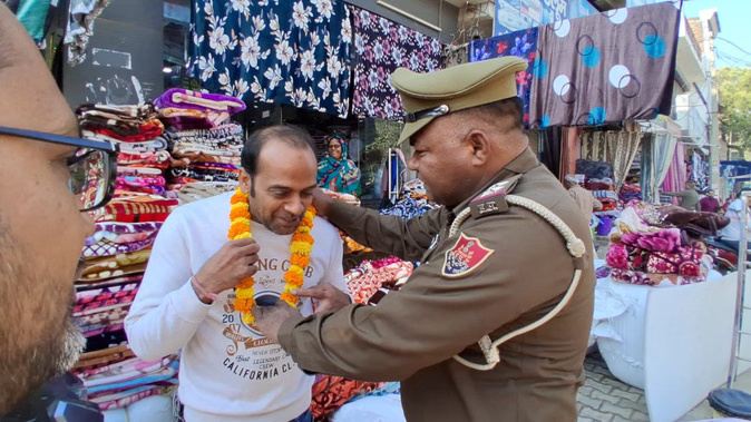 फुटपाथ कब्जा हटाने की अनोखी पहल: एसएचओ ने दुकानदारों को माला पहनाकर किया अनुरोध