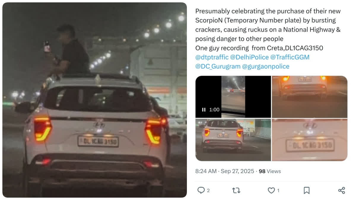गुरुग्राम: कानून की धज्जियां उड़ाने वाला मामला गुरुग्राम से सामने आया है. सोशल मीडिया पर वायरल वीडियों में युवक गाड़ी पर स्टंटबाजी करते नजर आ रहे हैं और सार्वजनिक स्थान पर हवा में पटाखे फोड़ते भी देखे जा सकते हैं. युवक चलती गाड़ी की छत पर आतिशबाजी करता हुआ दिखाई दे रहा है.