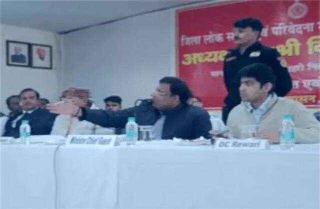 रेवाड़ी : रेवाड़ी में जिला ग्रीवांस कमेटी की बैठक में शुक्रवार को मंत्री विपुल गोयल ने जन समस्याओं की सुनवाई की। बाल भवन में आयोजित बैठक के दौरान अधिकारियों की लापरवाही सामने आने पर मंत्री ने सख्त रुख अपनाया। नगर परिषद के XEN अंकित वशिष्ठ को कार्य में निरंतर ढीलापन और शिकायतों के समाधान में असमर्थ जवाब देने पर चार्जशीट करने के निर्देश दिए गए।