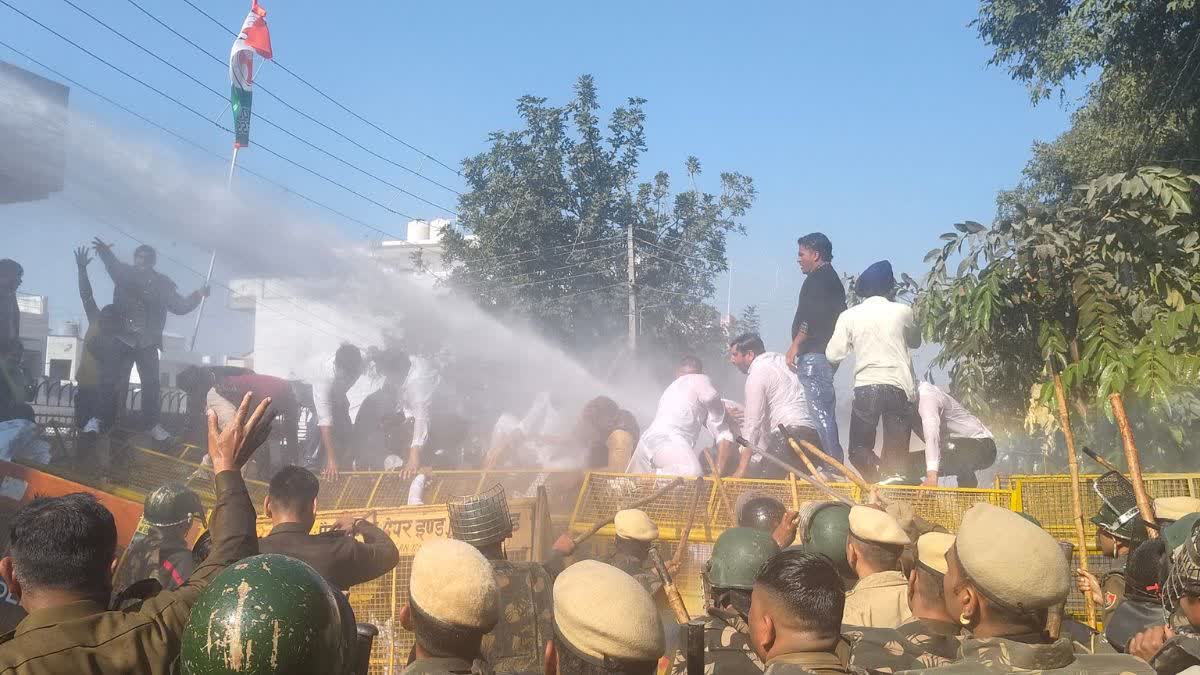 पुलिस ने कार्यकर्ताओं पर चलाए वाटर कैनन: इस बीच यूथ कांग्रेस कार्यकर्ताओं ने पुलिस बैरिकेड को पार करने का प्रयास किया, जिससे स्थिति तनावपूर्ण हो गई. पुलिस ने भीड़ को आगे बढ़ने से रोकने के लिए वाटर कैनन का प्रयोग किया. तेज पानी की बौछारों के चलते कार्यकर्ता बैरिकेड पार नहीं कर पाए और उन्हें पीछे हटना पड़ा. हालांकि कार्यकर्ता लगातार नारेबाजी करते हुए अपने लक्ष्य पर अड़े रहे और कहा कि उनका विरोध प्रदर्शन सीएम आवास तक पहुंचने के लिए ही है.